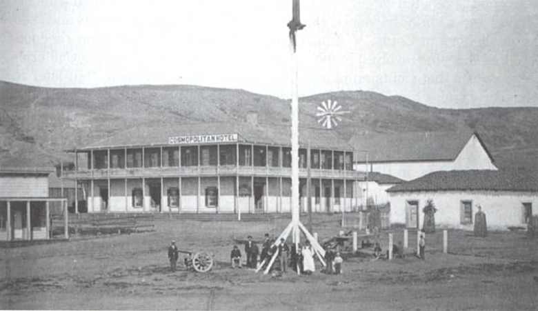 First raising of the U.S. Flag in Plaza San Diego Viejo, with the Cosmopolitan Hotel in the background on July 29, 1846. The flag was raised by Lt. Stephen C. Rowan, US Navy Commander of Sailors and Marines. The site is a California Historical Landmark 63. (Photo via Wikipedia/Public domain)
