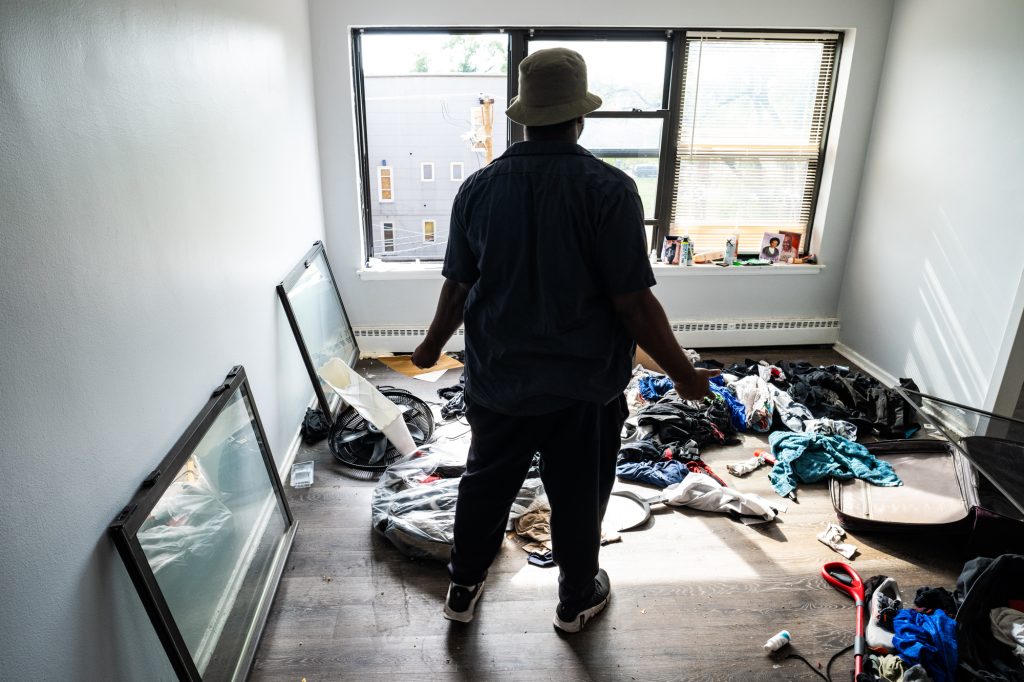 Dan returns to his apartment unit, which was completely ransacked and had items left behind that were not his — at 7500 S. South Shore Drive in South Shore on Oct. 1, 2025. The apartment building was raided by federal agents the morning before. Credit: Colin Boyle/Block Club Chicago