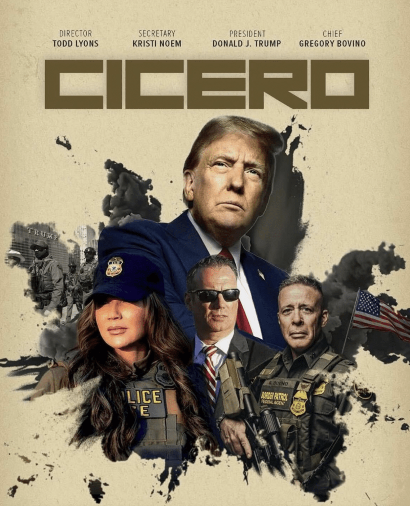 And on Oct. 24, the Department of Homeland Security posted a movie poster-like image of Trump, Bovino, agency director Todd Lyons and department Secretary Kristi Noem with the fake title, “Cicero.” In the post, the agency wrote that Oct. 22 had been one of the “most violent” days faced by agents and that “rioters” would not slow agents. But on that day, agents pepper-sprayed at least one person and detained several people, including at least two U.S. citizens, in Little Village and suburban Cicero.