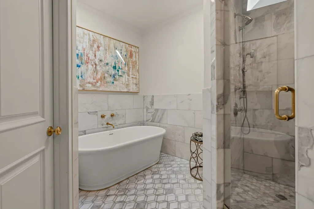 Of course, the ensuite bathroom is nothing short of the total spa package. With a spate of amenities, including multiple vanities, a grotto shower, and a stand-alone soaking tub, it encourages next-level luxury experiences. Immaculate expanses of marble and elegant fixtures define its sophisticated ambiance.