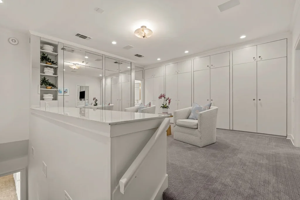 This one-of-a-kind primary suite is further set apart by dual master closets and a custom-designed dressing room that feels more like a boutique than a closet.