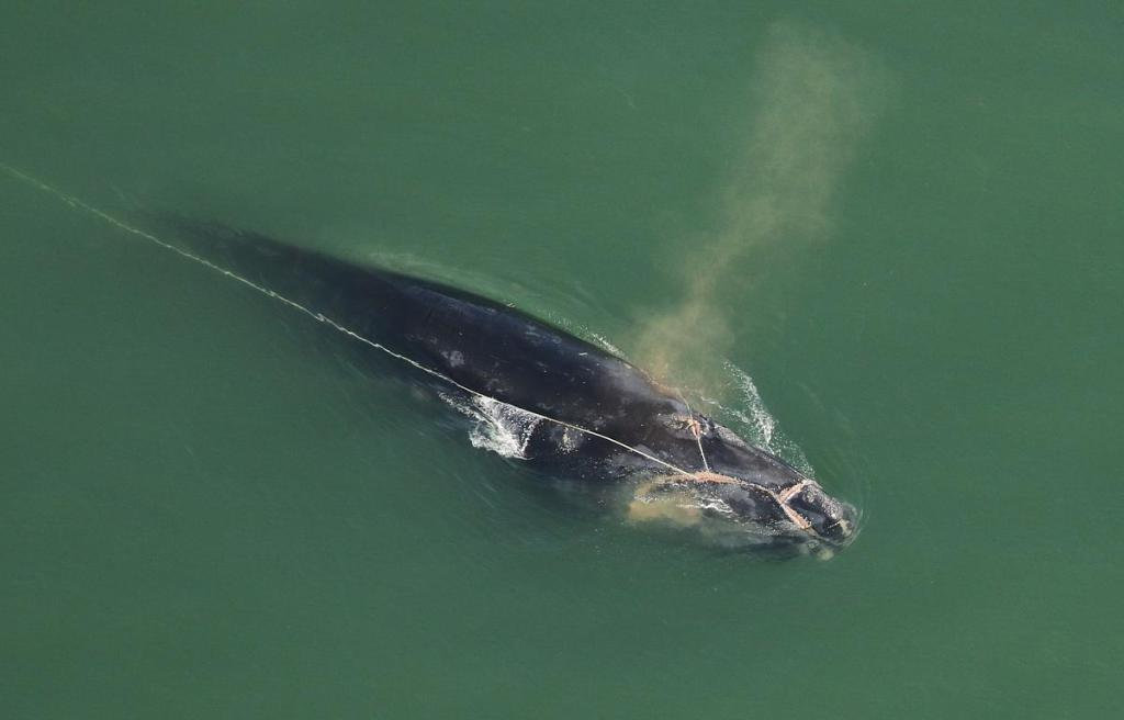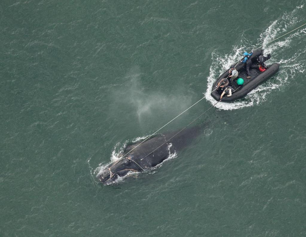 Using photographs transmitted from the aerial surveyors, teams on the ground and on the water assessed Division’s predicament. The Center for Coastal Studies based in Massachusetts coordinates the action through its Marine Animal Entanglement Response program. Like physicians, the wildlife biologists are committed to “first, do no harm.”