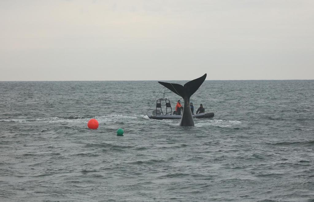 The teams removed the sea anchor and the two of other buoys that were kegging the whale. They then put the satellite tag buoy back on to keep tracking Division.