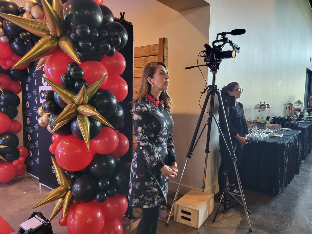Ericka Garza, president and CEO of the Fort Worth Hispanic Chamber of Commerce, prepares to speak to members during the 2025 State of the Chamber event Dec. 3 at Cullen Yards. (Eric E. Garcia | Fort Worth Report)