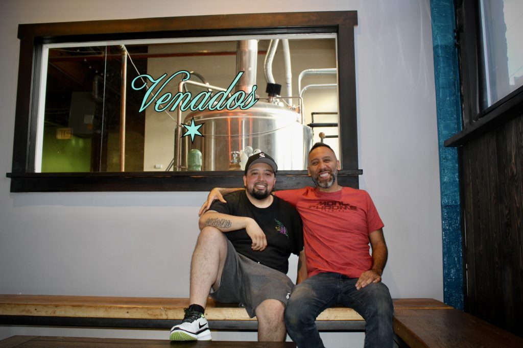 Luis Flores (left) and Enrique Rivera (right) in front of a window that reads “Venados.” The window is an ode to Venados Run Club, a group of neighbors who meet at Monochrome Brewing every Wednesday to run together. Credit: Jacqueline Cardenas/Block Club Chicago