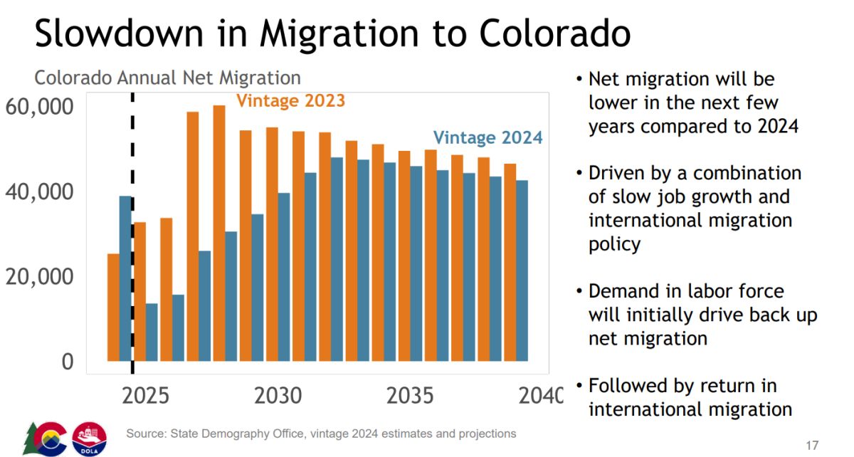 In the latest population update from the State Demography Office on Nov. 7, 2025, State Forecast Demographer Neal Marquez shared a slide showing how the year’s slowdown in job growth plus changes to international migration policy is slowing the number of new residents migrating to Colorado. The “Vintage 2024” is the revision to prior estimates. (Screenshot)