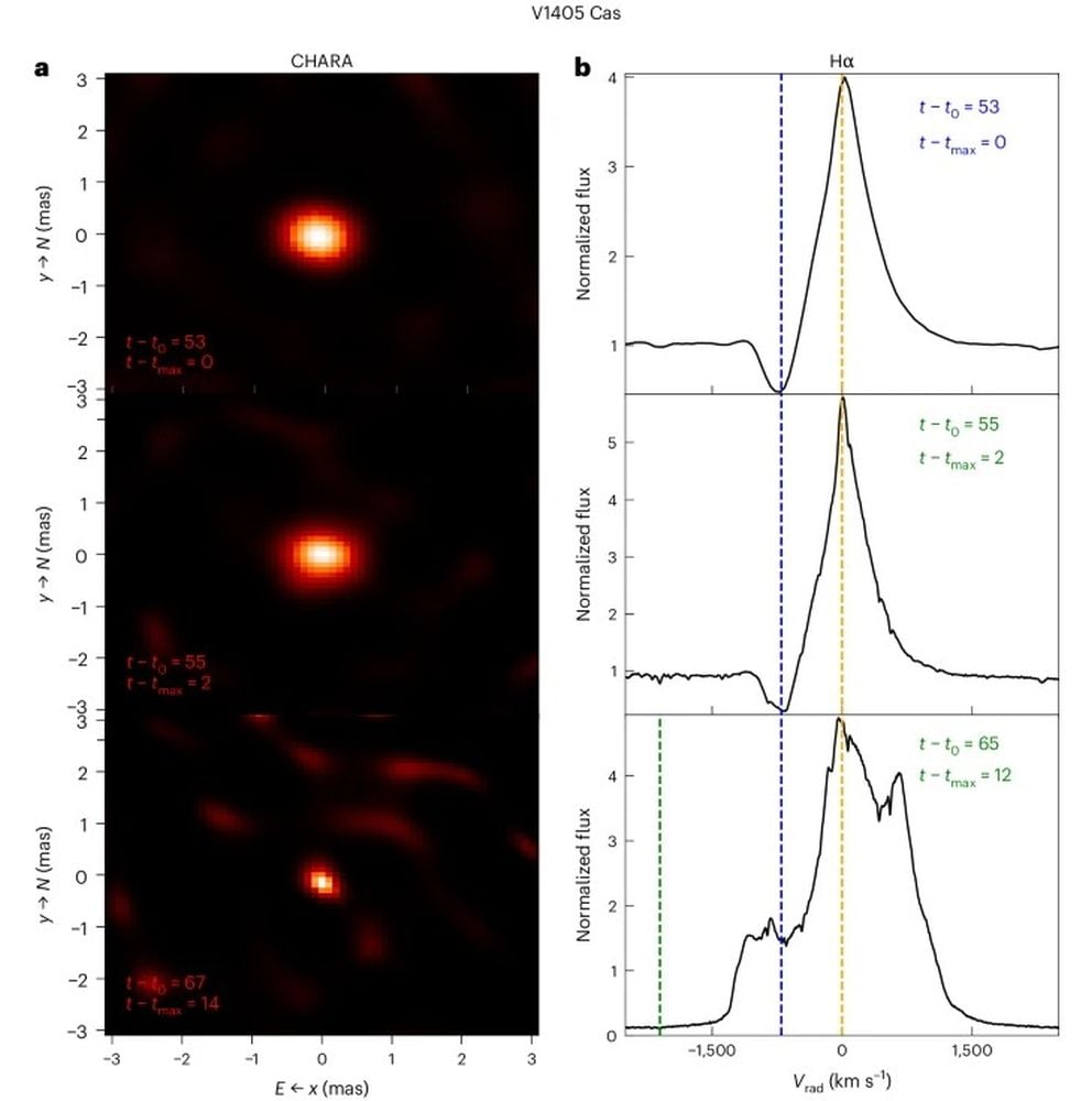 *Early imaging of V1405 Cas shows how the ejection of material was delayed more than 50 days after eruption. CHARA imaged it 53, 55 and 67 after explosion. The H-alpha emissions were measured 53, 55 and 65 days after the explosion. It generated shock waves that also triggered gamma-ray emissions. Image Credit: Aydi et al. 2025. NatAstr*
