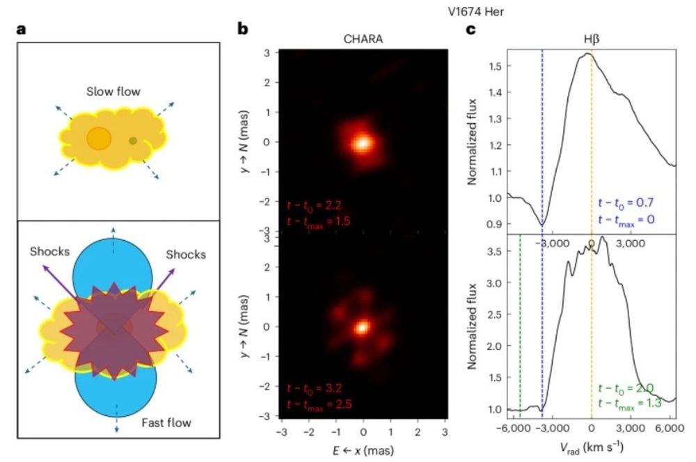 *These figures from the study illustrate how V 1674 Her experienced multiple explosions in rapid succession. (a) shows how a slow explosion first expelled material, then a second faster explosion expelled more material that slammed into the existing material, generating shocks and gamma-ray radiation. (b) are CHARA images showing the nova explosion at 2.2 and 3.2 days after it V 1674 Her was discovered. (c) shows Hβ (H-beta) spectral line profiles for hydrogen atoms. Image Credit: Aydi et al. 2025. NatAstr*