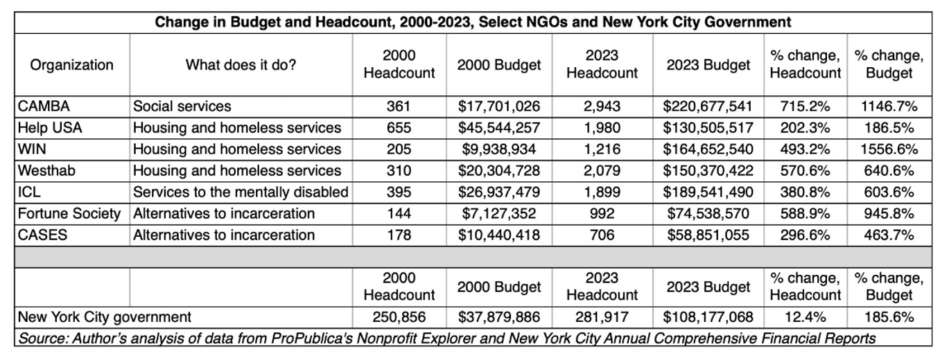 The table below shows some examples of NGOs whose growth rates—budget and workforce—have radically outpaced those of the municipal workforce and overall city budget.