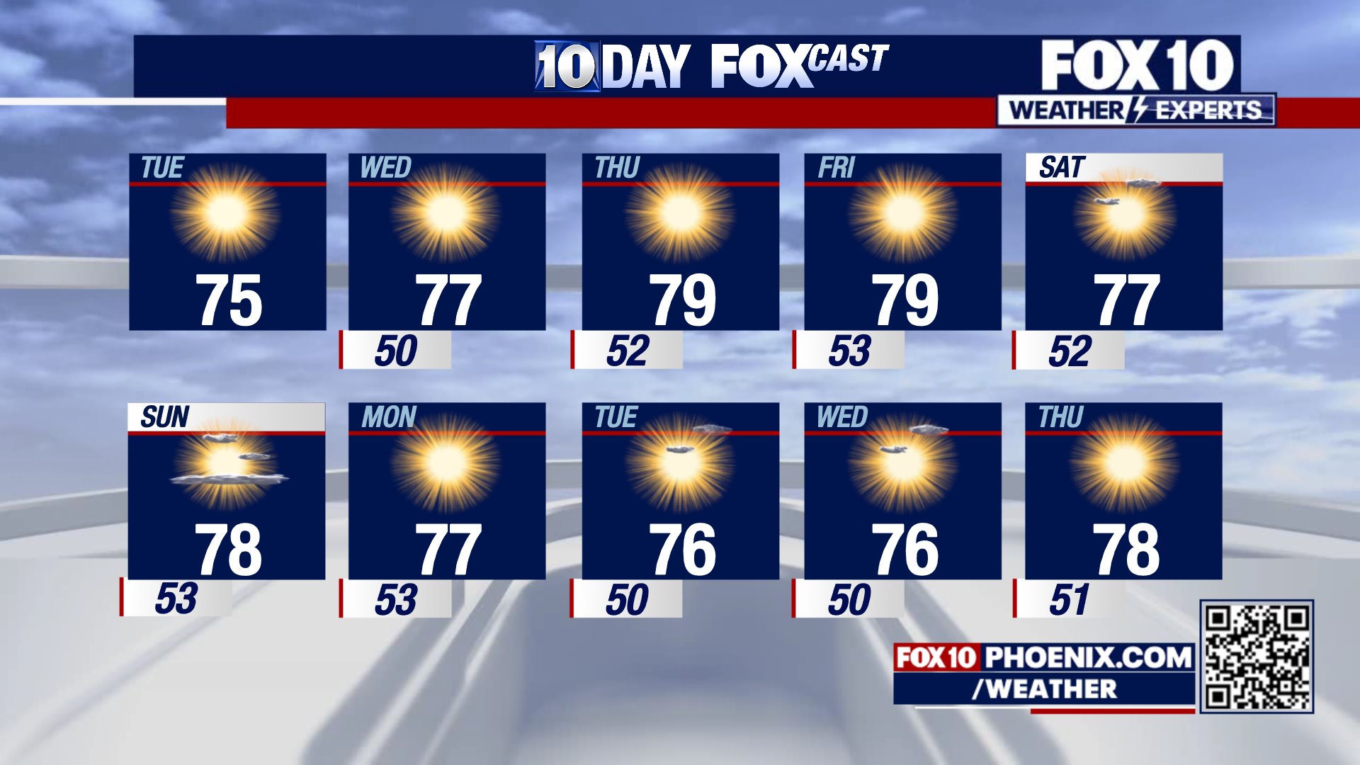 The forecast high will grow from 75 Tuesday to 77 Wednesday and 79 Thursday and Friday in Phoenix. Each day the winds will remain light and the sky clear.
