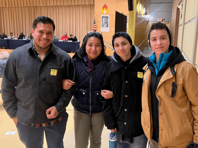 Elm City Montissori teacher Alejandra Corona Ortega (second from left) with friends: Ask for Board to tell educators and community how to support its state legislative efforts for increasing schools funding.