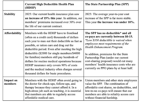 She said she’s talked with educators who have had to forego critical medical procedures because they could not afford the out-of-pocket cost. “As a result some of these coworkers come to work in pain and are also ill,” she added.