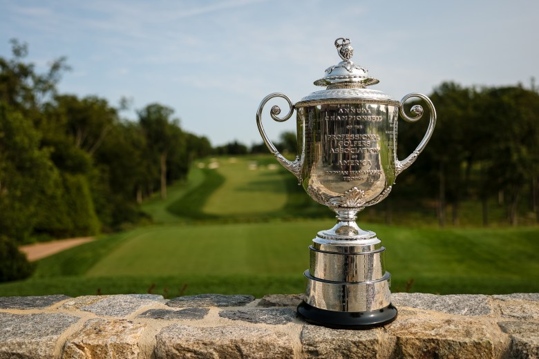 A general view of the Wanamaker Trophy in front of the first hole at the Aronimink Golf Club on June 2, 2025 in Newtown Square, Pennsylvania. (Photo by Scott Taetsch/PGA of America)