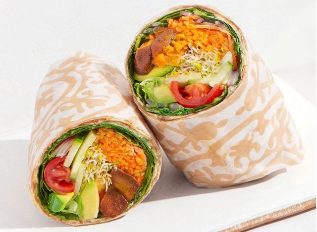 The Crunchie Veggie Wrap is made with roasted sweet potato, hummus, spinach, avocado, cucumber, tomato, carrot, sprouts, red onion, herb vinaigrette, and green tahini dressing on the side. Each wrap contains more than twice the fat in a Big Mac.