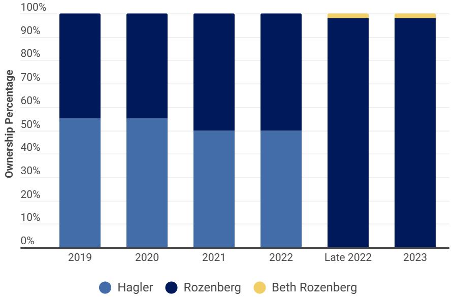 Hagler’s and Rozenberg’s individual shares of ownership in Centers have fluctuated. During the five-and-a-half-year period of OSC’s review, Centers was jointly owned by Hagler and Rozenberg until at least June 22, 2022, when Hagler was interviewed by the New York Attorney General’s office in connection with the investigation into four of his New York nursing homes. Tax returns suggest he divested his ownership of Centers at some point after that. Their shares of ownership of Centers during the period under investigation are shown below.