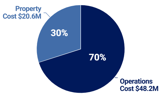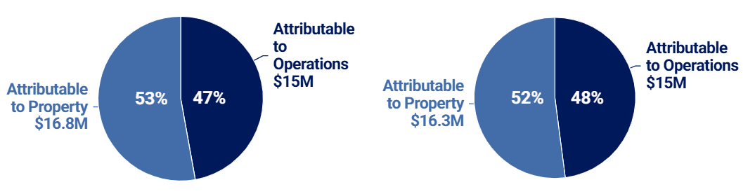 The appraisals conducted in connection with the 2017 refinancing did not separately value the costs of the operations and property—but the additional costs associated with the refinancing (e.g., the construction loan and seller-financed note) appear to be primarily related to the properties. Thus, with the refinancing, it appears that the ratio of property- to operations-related costs was split as follows: