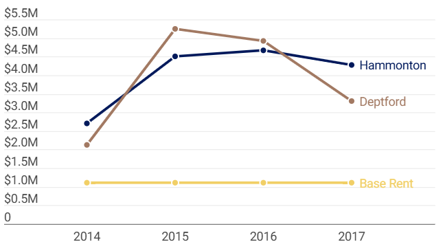 Cost reports submitted by the facilities from 2014 to 2017, show that these “additional rent” payments vastly exceeded base rent, adding millions more to the cost. Hammonton’s and Deptford’s “Building and Fixtures” costs were reported as shown below.