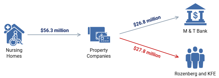 This investigation also found Hammonton’s and Deptford’s property companies diverted approximately $27.8 million in inflated “additional rent” payments to Rozenberg and KFE, exploiting related-party transactions to establish unauthorized profit centers and compromising funds meant for resident care. As noted above, bank records show that during the review period, Hammonton paid its property company approximately $26.9 million in total rent payments. See Figure 17. In that same period, the property company paid approximately $12.7 million to M&T Bank and $13.4 million to Rozenberg and KFE ($5.8 million and $7.6 million, respectively). Similarly, Deptford paid its property company approximately $29.3 million in total rent and the property company paid approximately $14.1 million to M&T Bank and $14.4 million to Rozenberg and KFE ($6 million and $8.4 million, respectively). Combined, Rozenberg and KFE received approximately $27.8 million from the property companies.