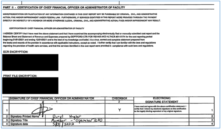 State cost reports include a certification that the report is true and correct that must be signed by an authorized representative of the facility. Federal cost reports similarly require nursing homes to certify that the information on the report is correct and that they have complied with all applicable rules and regulations. The federal cost report signature page includes the certification, which must be signed by a nursing home officer, warning that any misrepresentation on the cost reports is punishable by fine and/or imprisonment. The person signing the cost report on behalf of the nursing home must certify that the signer has read the certification, has examined the report, and to the best of his or her knowledge, the cost report is true, correct, complete, and that it was prepared from the nursing home’s books and records. 42 C.F.R. 413.24(f)(4)(iv)(B). OSC reviewed all federal cost reports for 2019 to 2023, and all state cost reports for 2022 to 2023.