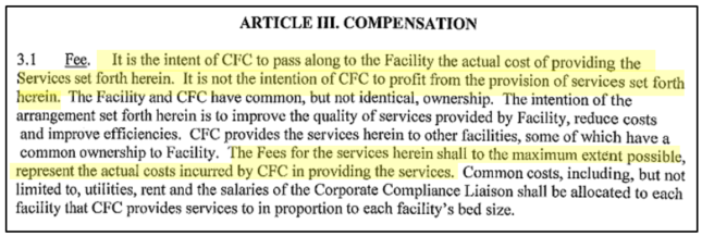 As shown below, the agreements state that Centers intends to charge Hammonton and Deptford for services at “actual cost,” as would be required for services provided by a related party, and state that it is not the intention of Centers to profit from the provision of services.