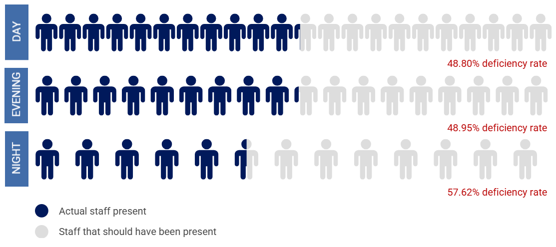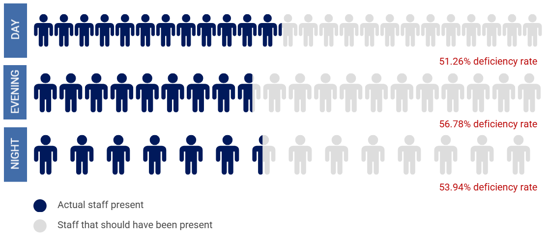 OSC found that Deptford failed to meet state minimum staffing requirements for 62 of 64 days it reviewed. On average, Deptford should have had at least 59 direct care staff in total but had a shortage of nearly 32 direct care staff each day. This amounts to a deficiency rate of 54 percent. And, for 52 days within the 64 sample days reviewed, Deptford did not have an RN on duty, as required. Deptford provided dangerously low staffing. See Appendix A for a summary of the staffing violations.