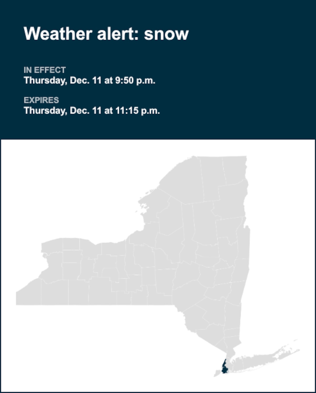 A weather alert was issued by the National Weather Service on Thursday at 9:50 p.m. for snow until 11:15 p.m. for Kings (Brooklyn) and New York (Manhattan) County.