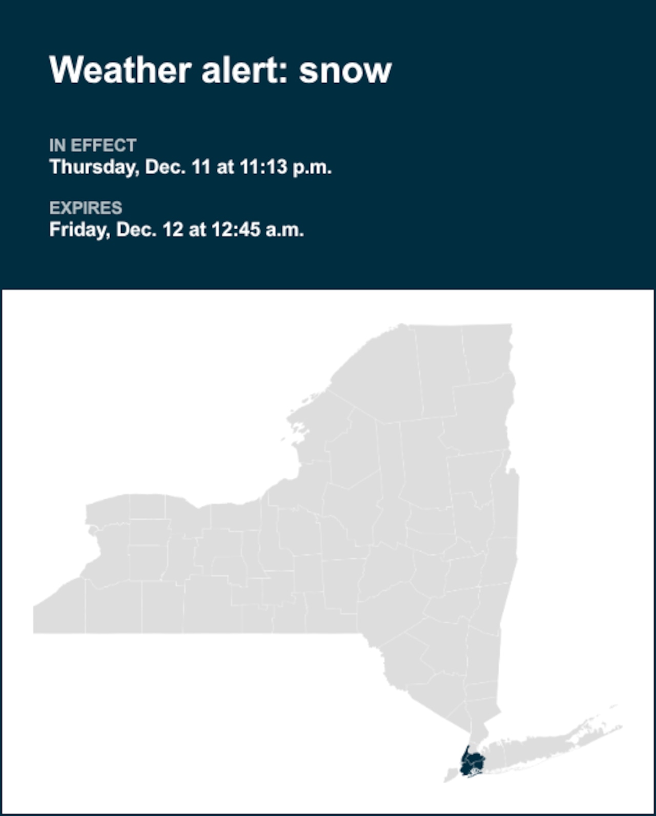 A weather alert was issued by the National Weather Service on Thursday at 11:13 p.m. for snow until Friday at 12:45 a.m. for Manhattan, Brooklyn and Queens.