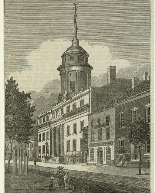 The original Merchant’s Exchange building, one of New York’s more ornate building, featuring a statue of Alexander Hamilton standing nobly in its rotunda. (Illustration courtesy the New York Public Library image gallery)