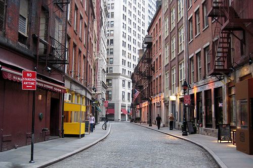 Most of the buildings on today’s Stone Street were built in the immediate years following the fire, Greek Revival-style countinghouses that are refitted for modern times as taverns and restaurants. It’s also one of the few cobblestone streets still around in the Financial District area.