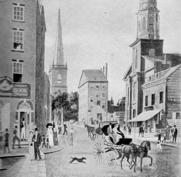 Before the blaze: Charming Wall Street in 1825, from a 1920s guide book. Prosperity from the Erie Canal was just around the bend. (Courtesy Ephemeral New York)