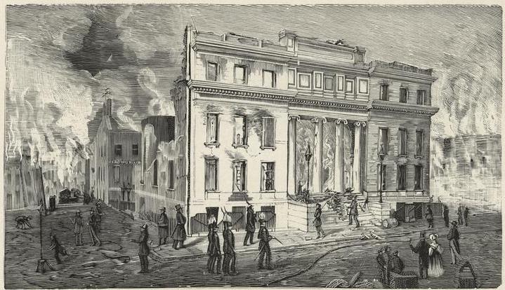 City officials, including mayor Cornelius Lawrence, could only watch and stare as the blaze over takes a stretch of prominent buildings. Also included below is Charles King, who watches as his newspaper the New York American is overcome by the fire.