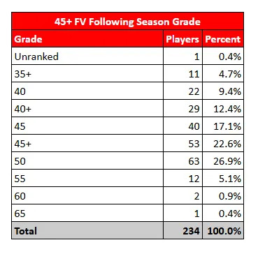 Below we will walk through the historical ranking trends of prospects by FV bucket. I am including the graduation rate for reference, but a prospect graduating is not included in the table summary. The FV ranking in the table is for the next season only, not their final prospect grade before graduating. One final note, I do not necessarily agree with all of the Fangraphs grades, but to stay consistent, I am showing how Fangraphs has the current crop of Cardinals prospects ranked. If it were my grades, we would be creating a new tier for Rainiel Rodriguez!