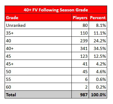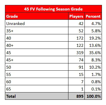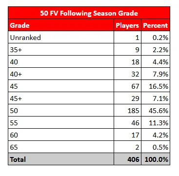 Thanks to the great work by the Fangraphs prospect writers over the years, we have a ton of prospect data at our fingertips. From 2017 to 2025, Fangraphs has ranked and graded over four thousand prospects and over 10 thousand prospect seasons. Fangraphs assigns a future value (FV) score with players receiving a 50 or greater typically being Top 100 prospects in a given season. Without going too far into the weeds, a quick reference on what FV score correlates to: