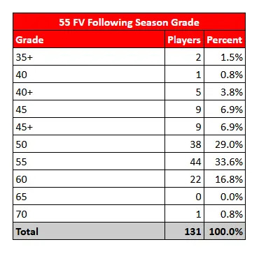 34.5% of the total 200 prospects given a FV 55 since 2017 have made their major league debut and exhausted their prospect eligibility the following season. Unless something goes wrong, we can expect Wetherholt to join this group before next season’s prospect lists are published. Liam Doyle might have a good year and make a major league debut while still remaining a prospect. Based on this data, we can say that he has roughly an 80% chance to maintain a Top 100 ranking and an 18% chance of improving on his grade. Only one player has made the jump from the 55 to the 70 tier in one season, which Vlad Guerrero Jr. did back in 2018.