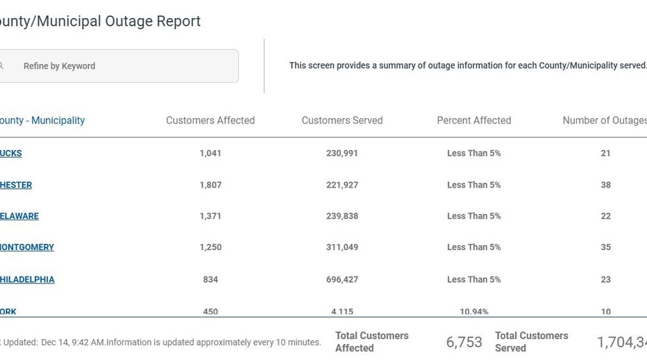 PECO says outage data updates approximately every 10 minutes. Crews are working across affected counties, but restoration times may vary depending on storm conditions and access.