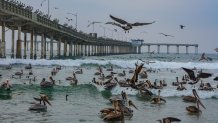 Beachgoers in OB over the weekend were treated to the sight of a massive flock of brown pelicans feeding and swarming the pier.