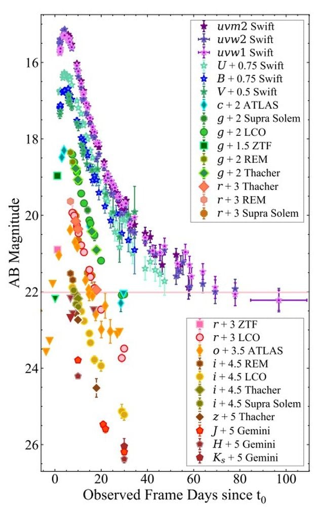 *This figure from the research illustrates the different observatories that observed AT 2024wpp and the data that they collected they collected in different wavelengths. Image Credit: LeBaron et al. 2025. ApJ*