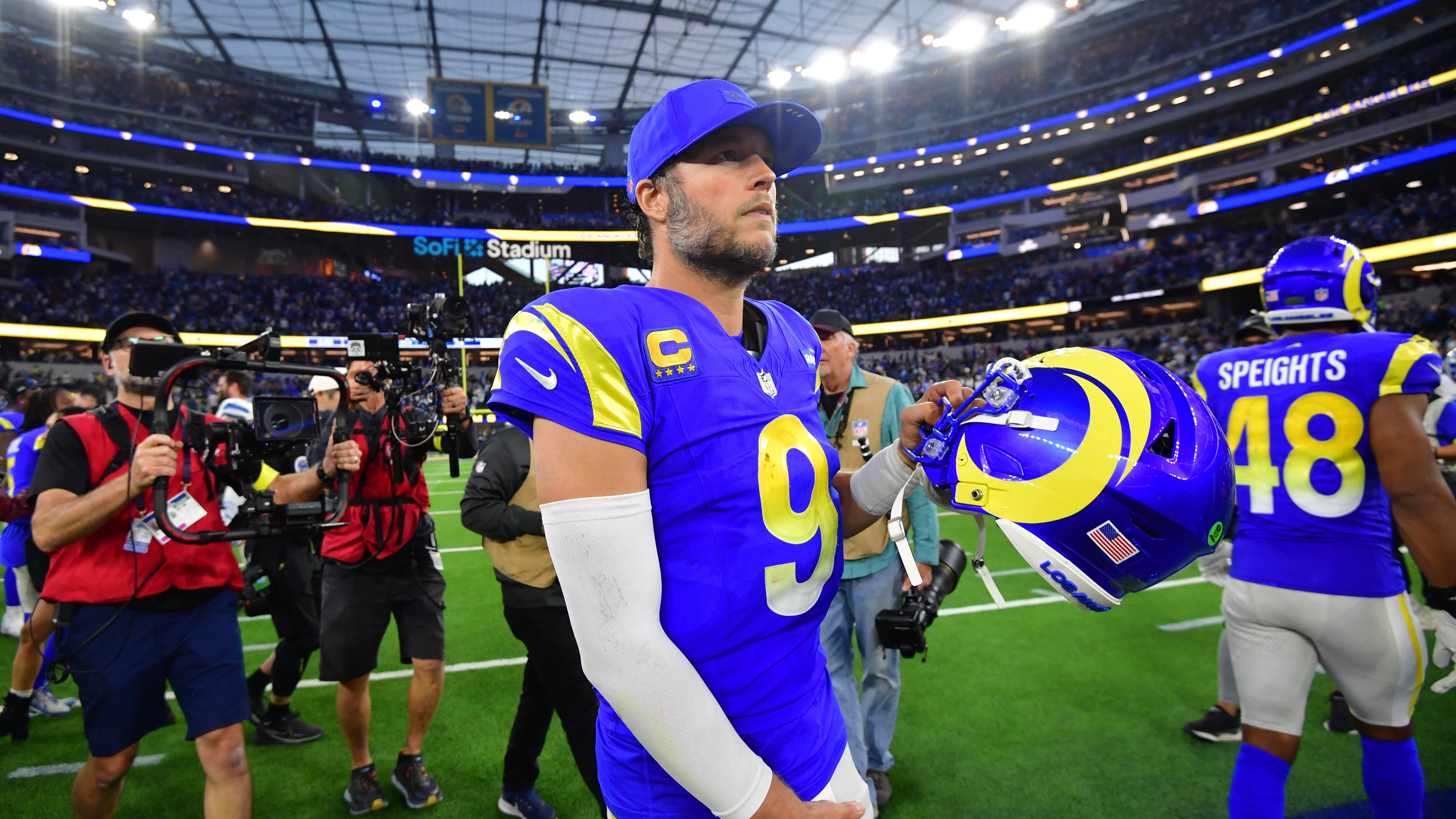 The Rams passer was shaken up after a hit by a Seahawks defender, and paid a trip to the blue medical tent. He wouldn’t miss a play, however, and he was back on the field on the ensuing Los Angeles possession.