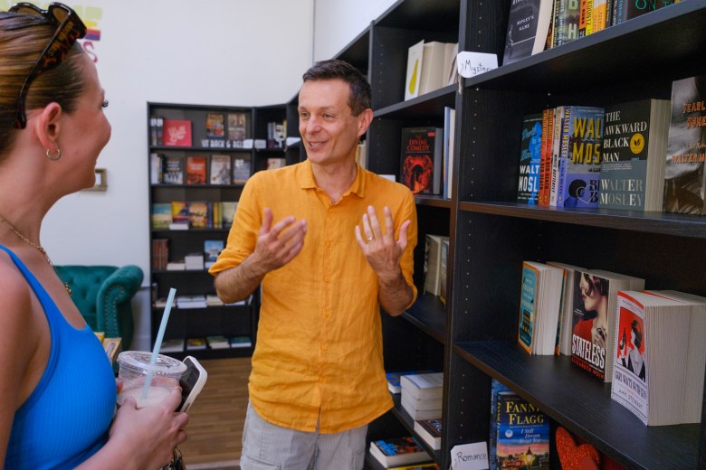 Business owner Alberto Bisi assists Hailey Eddy at San Antone Books, the bookstore he opened three months ago on the edge of the Monte Vista and Tobin Hill neighborhoods. Credit: Clint Datchuk for the San Antonio Report
