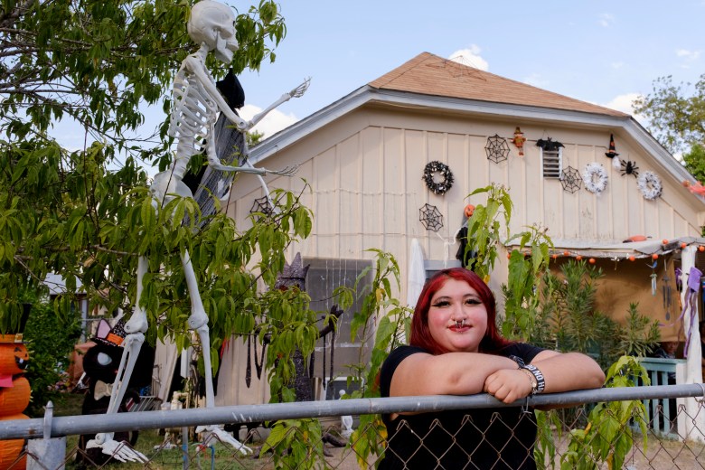 Amber DeLeon poses for a portrait in front of her grandmother’s home in the East Side of San Antonio on Thursday, Oct. 16, 2025. Credit: Clint Datchuk for the San Antonio Report