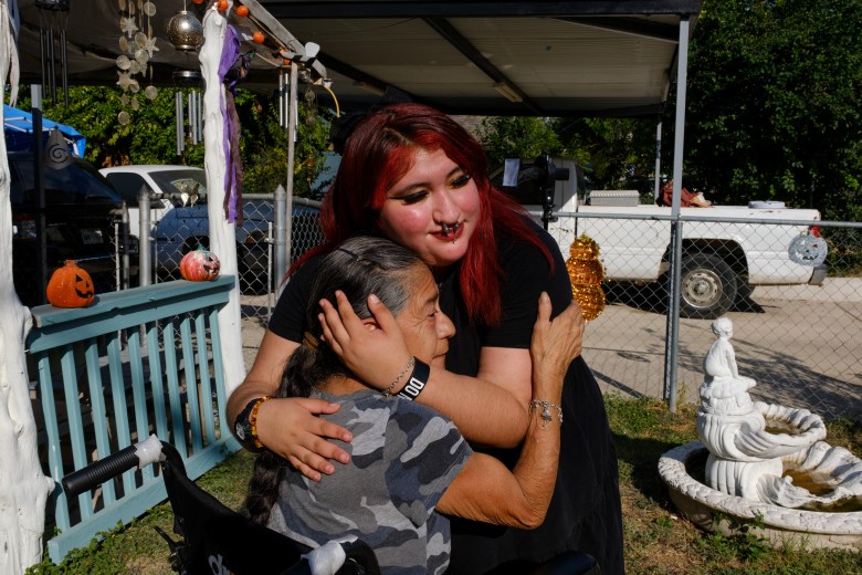 Amber Deleon embraces her grandmother Yolanda Contreras at Yolanda’s East Side home on Thursday, Oct. 16, 2025. Credit: Clint Datchuk for the San Antonio Report