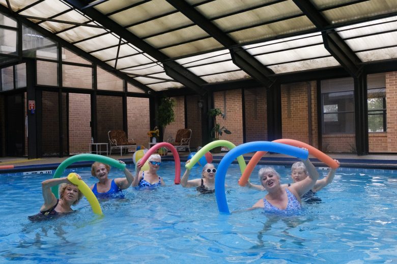 Marcia Holliman enjoys time at the pool with friends at the Army Retirement Community. The pool and focus by community members towards leading an active lifestyle was a major factor in her decision to move there. Credit: Clint Datchuk for the San Antonio Report