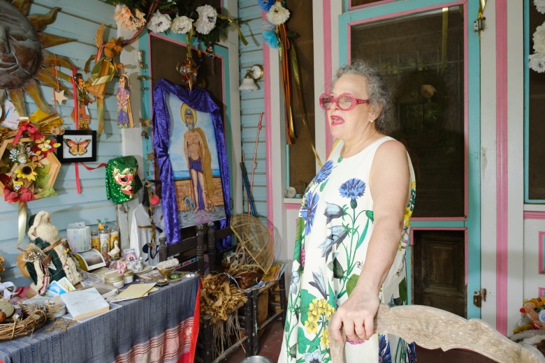 An altar space constructed of different pieces of art, trinkets and momentos adorn the front porch of Penelope Boyer’s home in Lavaca. Credit: Clint Datchuk for the San Antonio Report