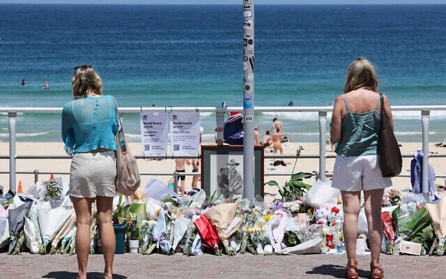 People stand in front of floral tributes left at the promenade of Bondi Beach in Sydney on December 18, 2025, to honor victims of the terror shooting that targeted a Jewish event there on December 14, 2025. (DAVID GRAY / AFP)
