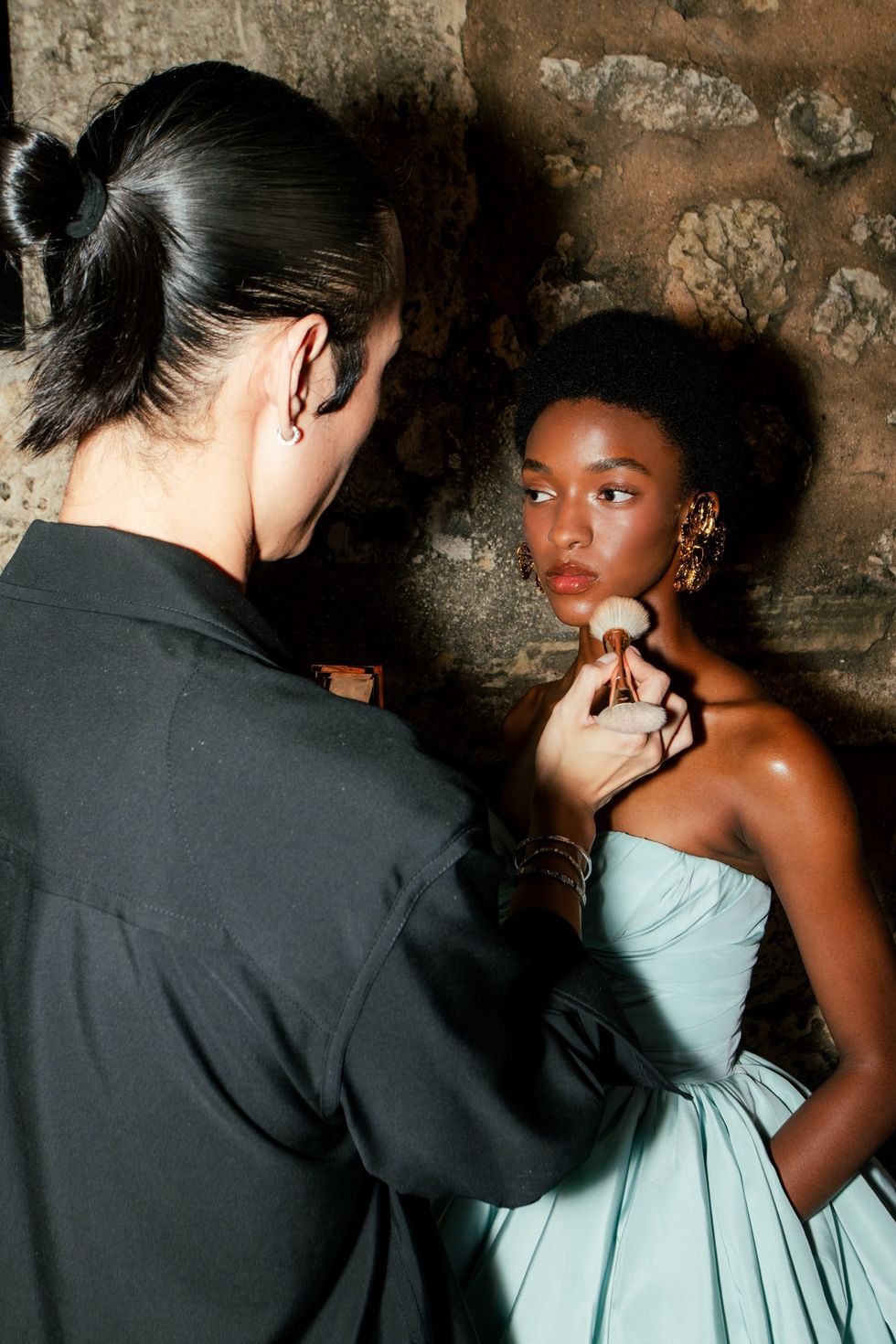 I knew that Oscar De La Renta is known for creating elegant party dresses in varying degrees of playfulness and polish, but I also learned that this Pre-Fall 2026 show was being held in Santo Domingo as an homage to his hometown and the 60th anniversary of the house of Oscar. The island’s influence is all over his archival collections in the prints, motifs, and colors. But this show brought it home even more, with a cast of 50 models, all of Dominican descent, and local hairstylists and makeup artists assisting backstage. Ta had worked with Oscar De La Renta creative directors, Laura Kim and Fernando Garcia, previously having done makeup for their brand Monse, and he was the obvious and only choice for one of their last collections with De La Renta.