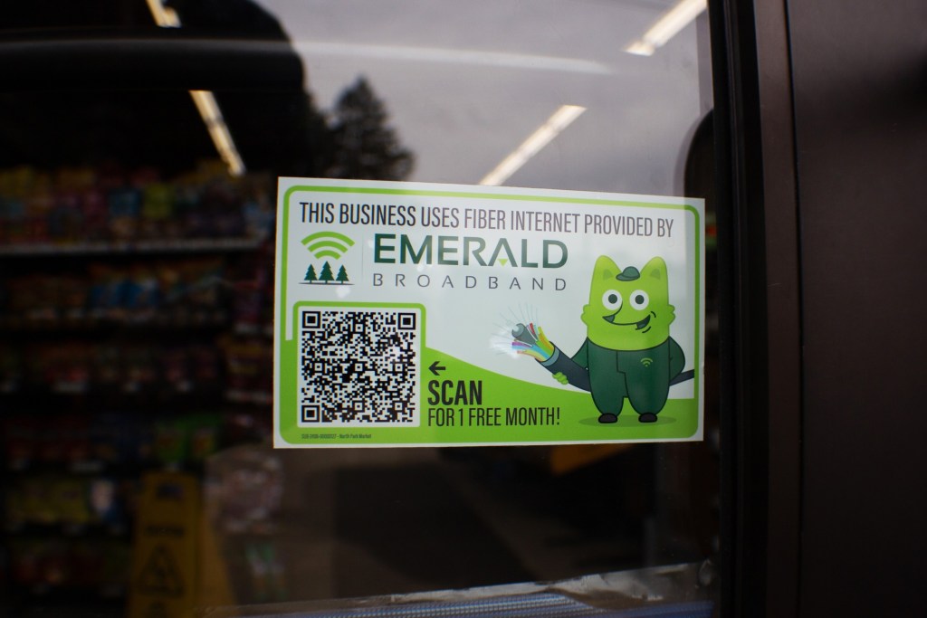 A local business displays their referral decal to spread the word and earn free internet. Credit: Emerald Broadband