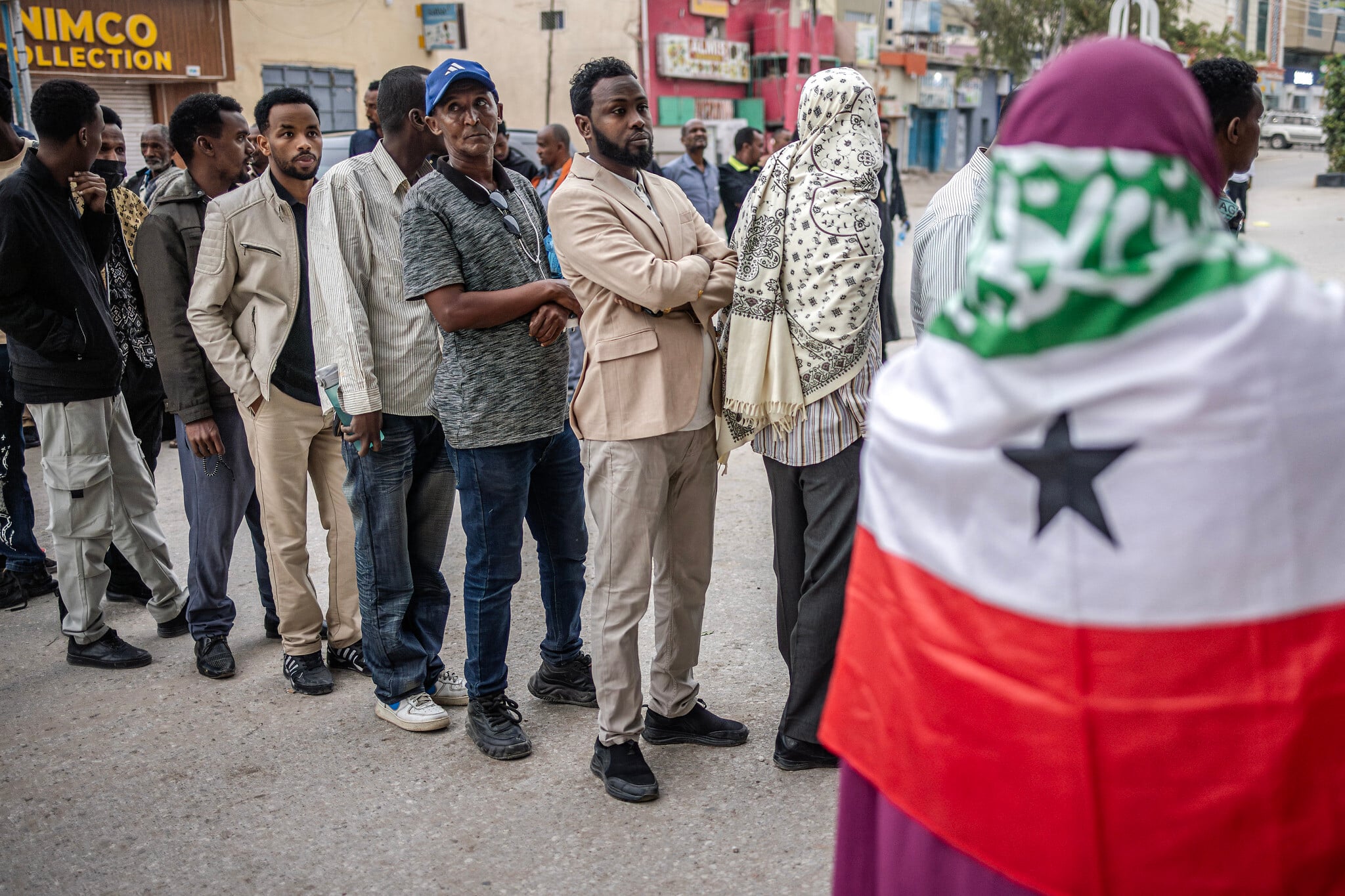Voters queue to cast their votes as a woman covers herself with a Somaliland flag before the opening of the polls during the 2024 Somaliland presidential election in Hargeisa on November 13, 2024. (LUIS TATO/AFP)