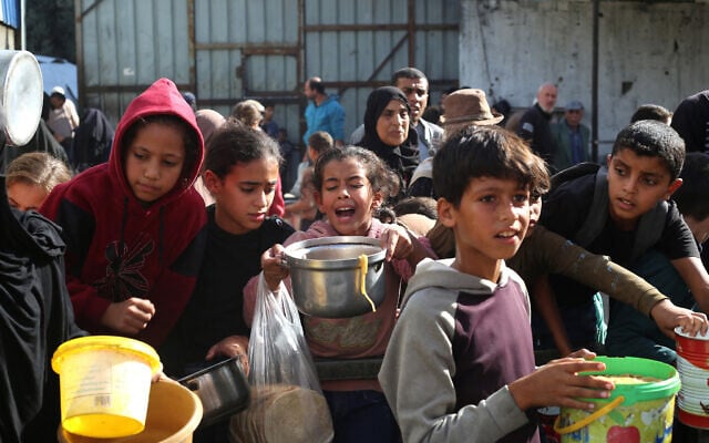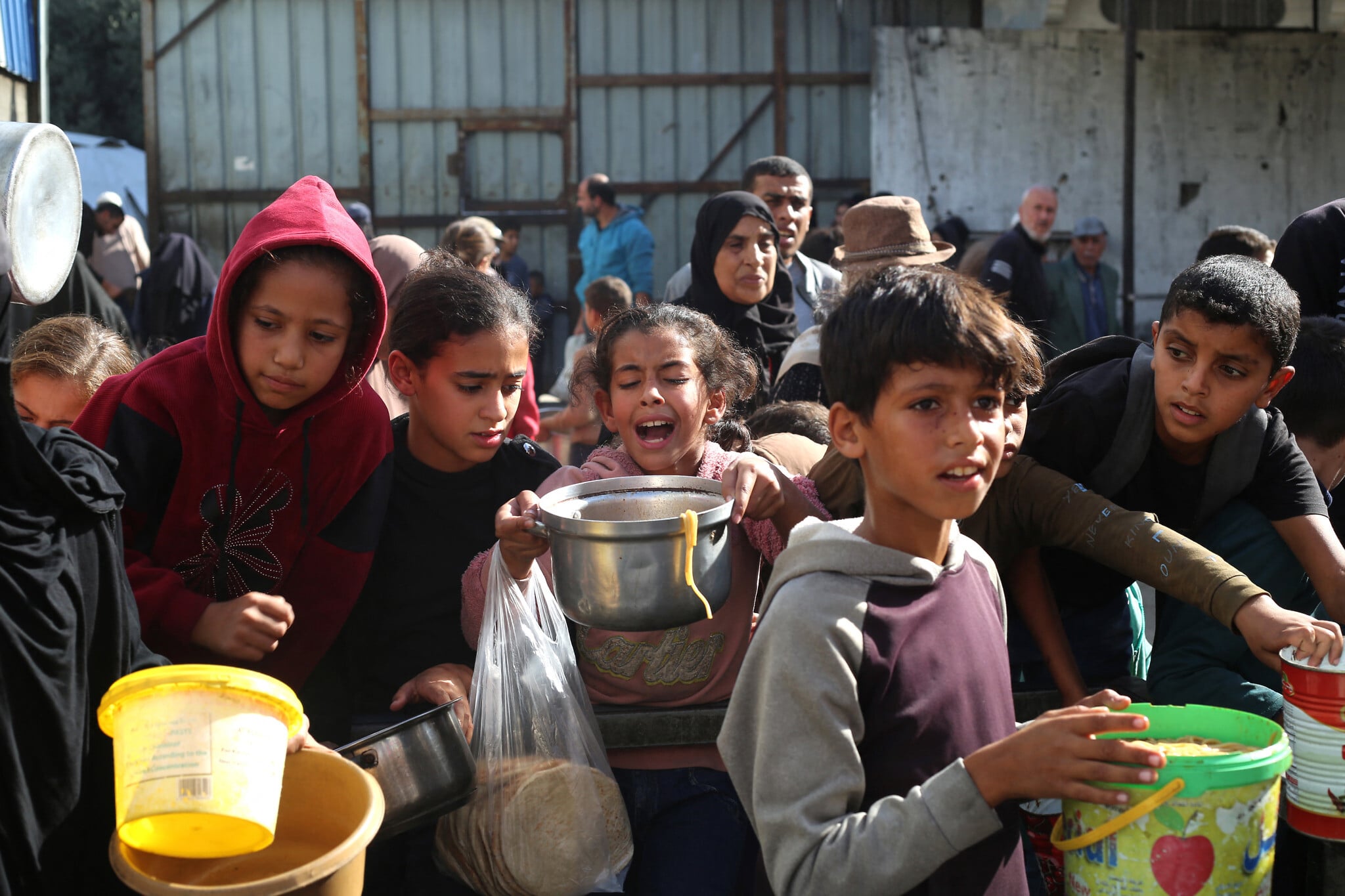 Displaced Palestinians wait for food at a shelter where families have been living in Nuseirat, central Gaza Strip, on November 23, 2025. (EYAD BABA / AFP)