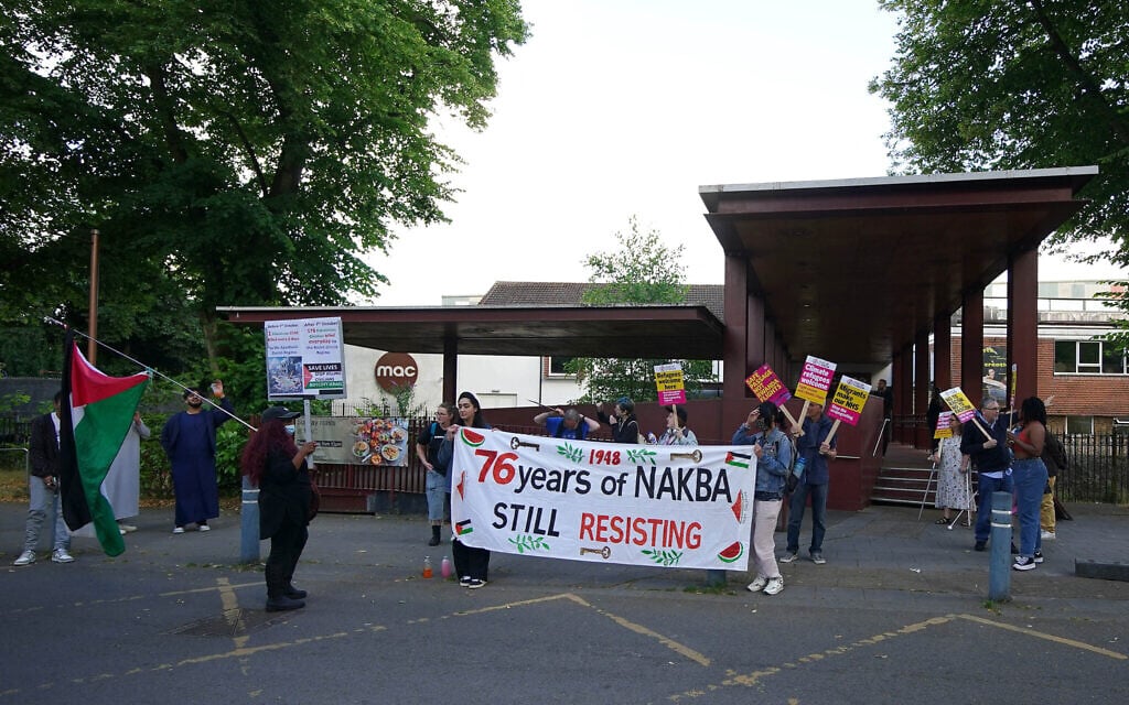 Protesters hold an anti-Israel, pro-Palestinian banner outside a BBC broadcast of an event featuring the Green Party and anti-immigration Reform UK party in Birmingham, England, on June 28, 2024. (Peter Byrne / POOL / AFP)