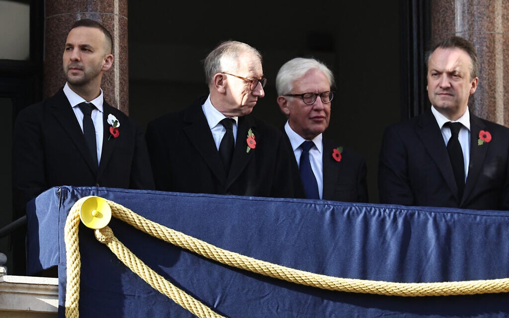 From left to right: Green Party leader Zack Polanski, Philip May and Hugh O’Leary attend the Remembrance Sunday ceremony at the Cenotaph on Whitehall in central London on November 9, 2025. (HENRY NICHOLLS / POOL / AFP)